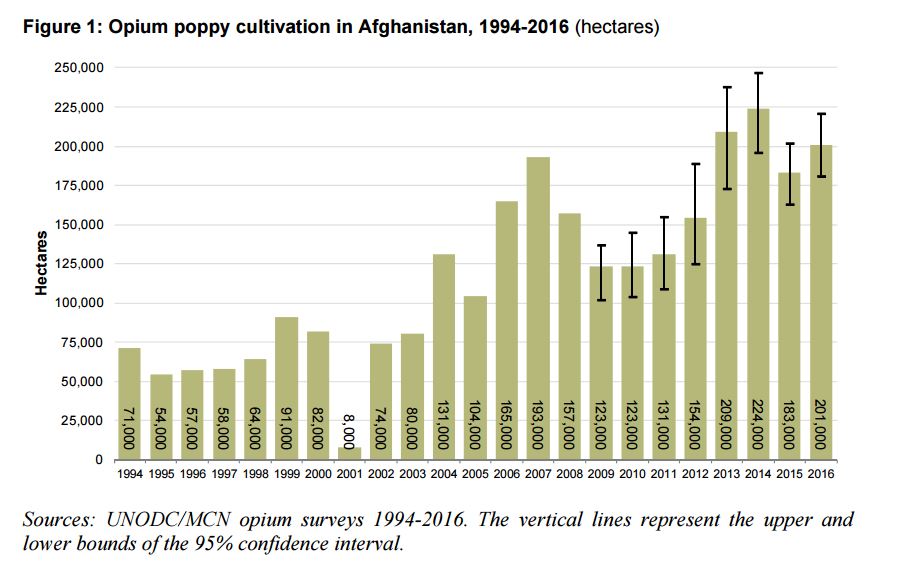 The total area under opium poppy cultivation in Afghanistan was estimated at 201,000 hectares (182,000 – 221,000) in 2016, which represents a 10% increase from 2015. Strong increases were observed in the Northern region and in Badghis province where the security situation has deteriorated since 2015.