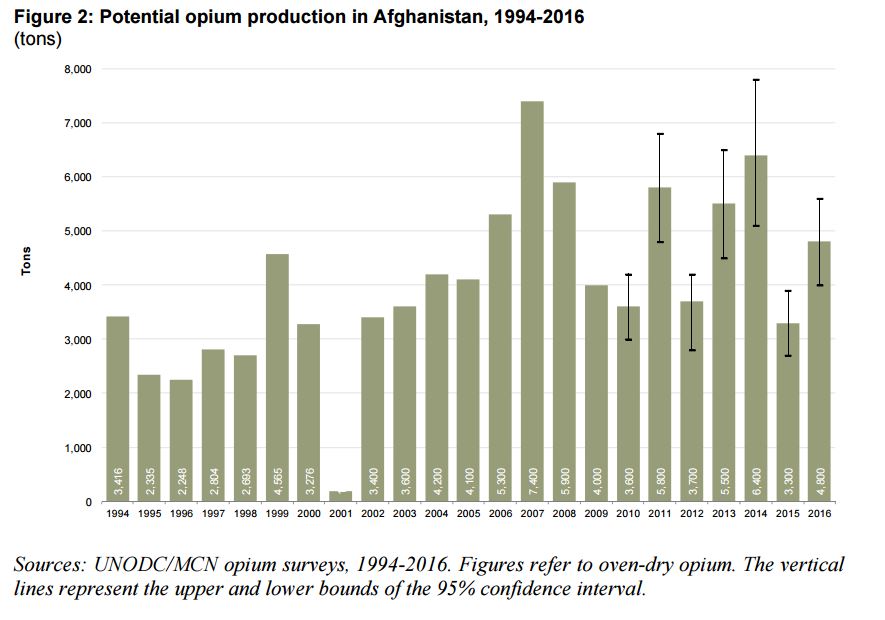 In 2016, the estimated potential opium production in Afghanistan amounted to 4,800 tons (4,000- 5,600 tons), an increase of 43% from its 2015 level (3,300 tons). The average opium yield was 23.8 kilograms per hectare, which is 30% higher than in 2015 (18.3 kilograms per hectare). There were no widespread reports of any diseases affecting the quality of the opium poppy crop.