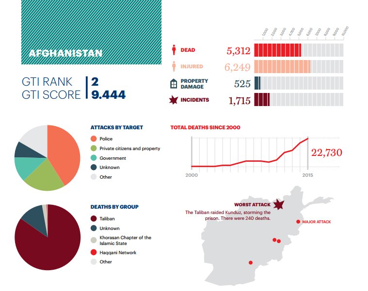 “The Taliban was responsible for the majority of terrorist attacks and in 2015 they were responsible for 85 per cent of all deaths from terrorism carrying out 1,094 attacks that killed 4,502 people. Police remain the main target of attacks by the Taliban and accounted for half of all attacks and deaths. There were 543 attacks on police resulting in 2,259 deaths.