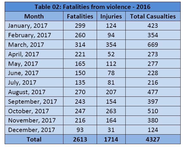 Violence-related fatalities saw an almost 45% reduction in the year 2016 following a continued trend of reduction from 2014 onward. Since 2014, the overall reduction in violence-related fatalities has been nearly 66%. In comparison to 6,572 casualties (4,647 dead and 1,927 injured) reported in 2015, the figures declined to 4,327 (2,613 dead 1,714 injured) in 2016 (table 01). This is primarily because of the kinetic operations across the country by security forces, both military and civilian.