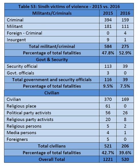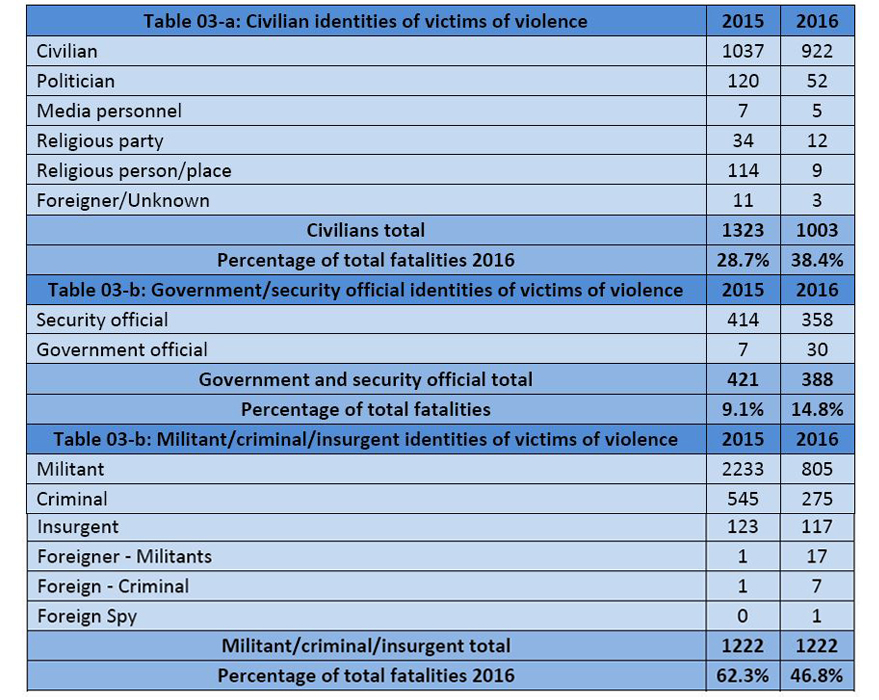 Despite significant decline in the fatalities from violence, the percentage of civilian and security personnel’s fatalities still stood comparatively higher than the fatalities of militants and criminals – from 38% in 2015 the percentage increased to 53% in 2016 – a rise of 15% (table 03). The reason for this rise will be discussed separately in the section titled “Nature and Methods of Violence Used.”