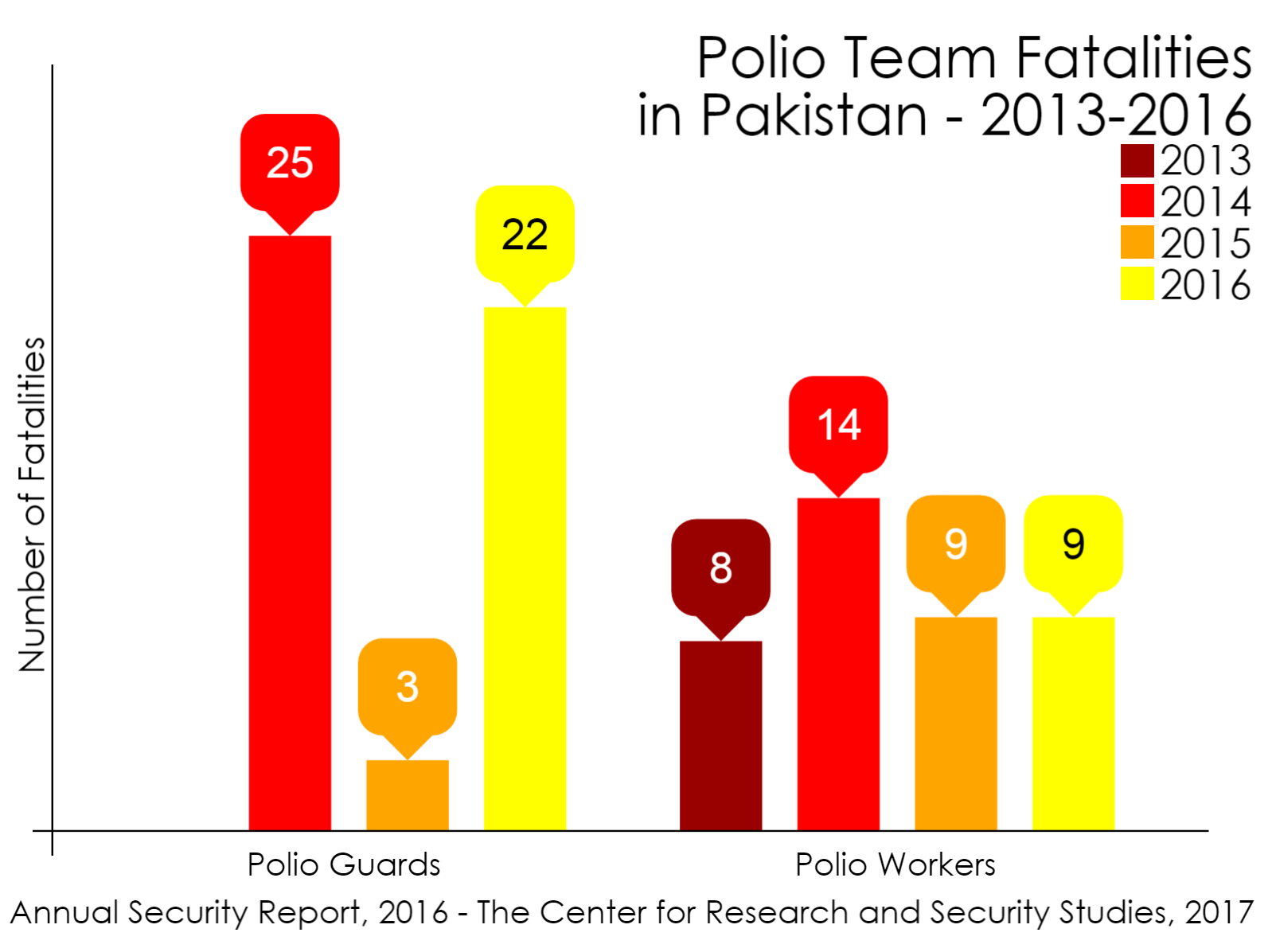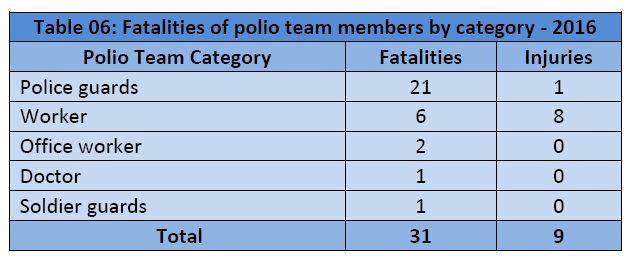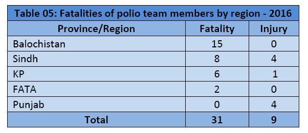 Eradication of polio from Pakistan is an uphill task for the government and polio teams in the country. The risks involved in accomplishing this task are many, ranging from lack of access, to mindsets that believe the vaccination campaign is a front for the Central Intelligence Agency (CIA). In 2015, 12 persons associated with polio eradication program lost their lives to violence[8]. The figure went up to 31 in 2016. While Balochistan suffered the highest fatalities of polio workers, other parts of the country also witnessed attacks (table 05).