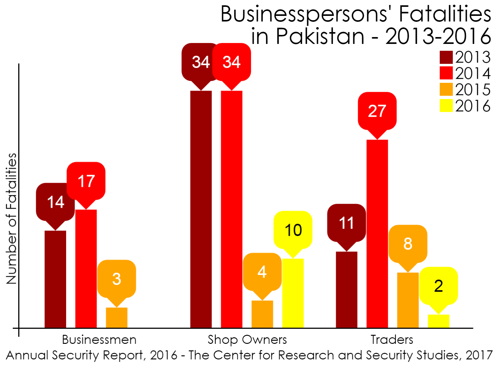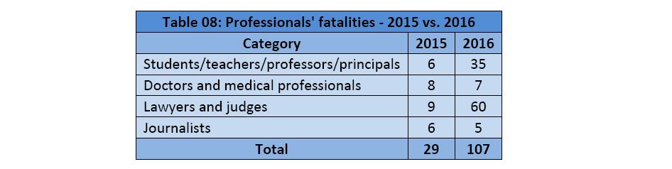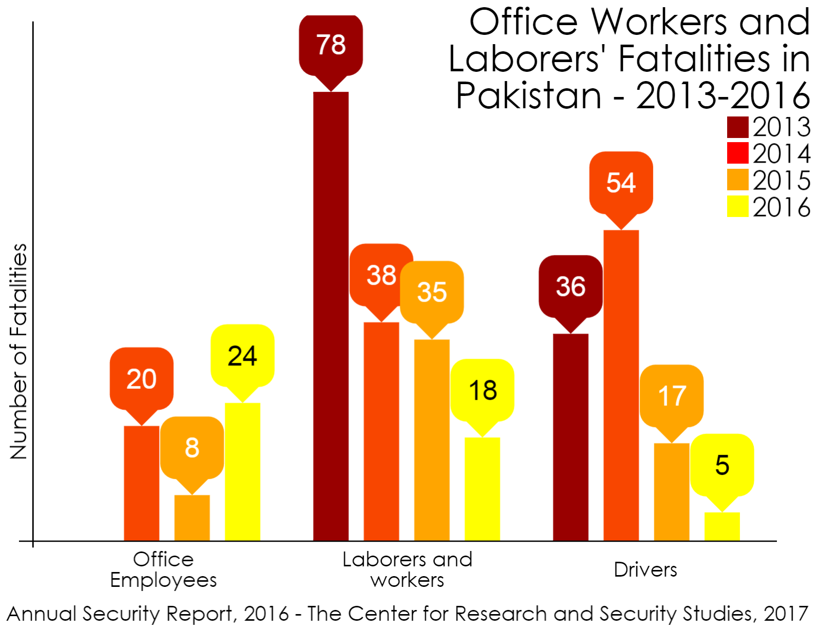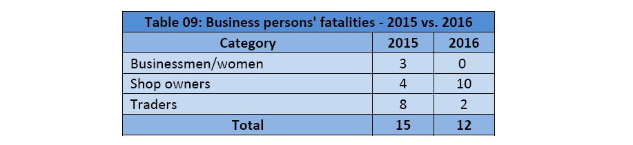 The businessmen and traders had a relatively peaceful time this year, with the exception of shop owners who were killed in robberies. Fatalities of office employees went up to three times this year compared to the last year (tables 09, 10). On March 17, 2016, a large number of low cadre government office employees lost their lives when an IED planted on a bus carrying them to their workplace exploded at Sunehri Masjid Road near the West Cantonment Police Station in Peshawar. Sixteen persons, including government employees, were killed and 53 others sustained injuries in the incident. LI claimed the responsibility for the attack.