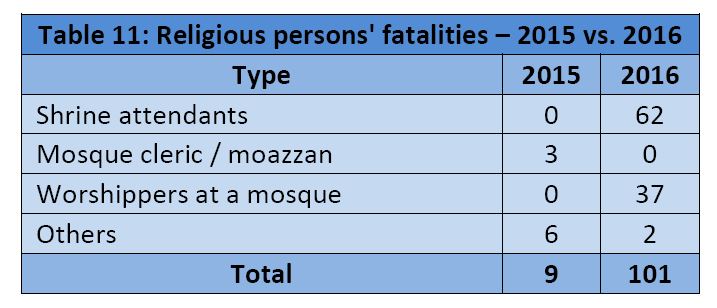 A large number of civilians performing their religious duties were targeted by militants dramatically increasing the number of fatalities from 9 last year to 101 this year (table 11).