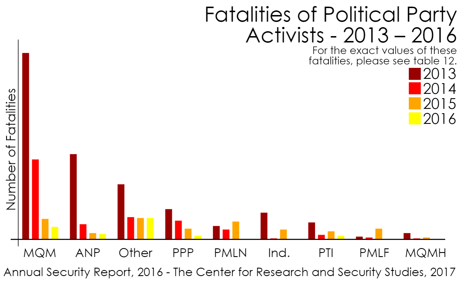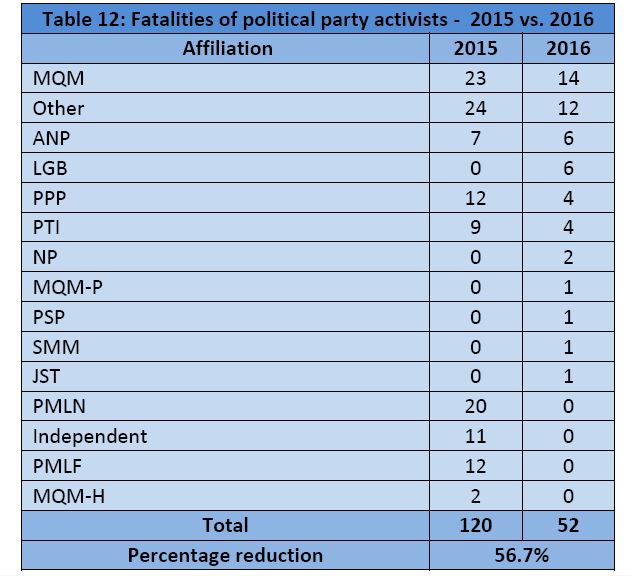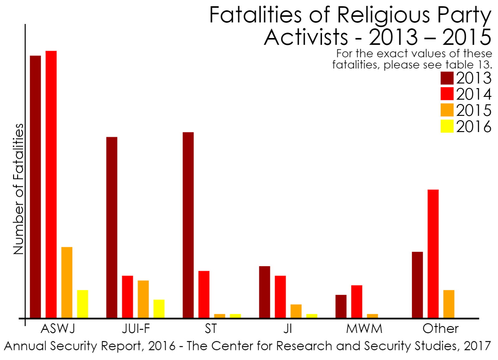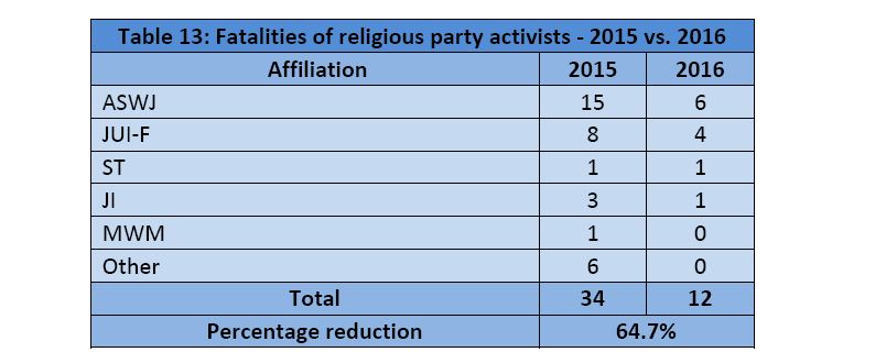 A significant decline in the number of fatalities of religious party activists was observed during this year – from 34 in 2015 to 12 in 2016. All religious party activists were victims of target killings but none succumbed to terror attacks. No militant outfit claimed responsibility for these killings and no statement was issued by the government officials or the religious parties pin pointing local or foreign involvement in these killings. Most of the religious party activists, belonging to Alhe Sunnat Wal Jamaat (ASWJ), Sunni Tehrik (ST), and Jamaat-e-Islaami (JI), were targeted in Sindh while four of them, affiliated with Jamiat-e-Ulema-e-Islam, Fazl-ur-Rehman group (JUI-F), were targeted in KP and Balochistan.