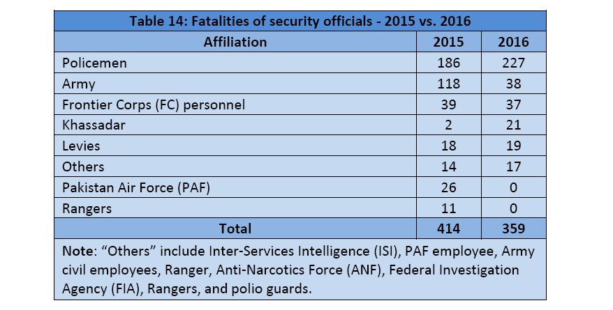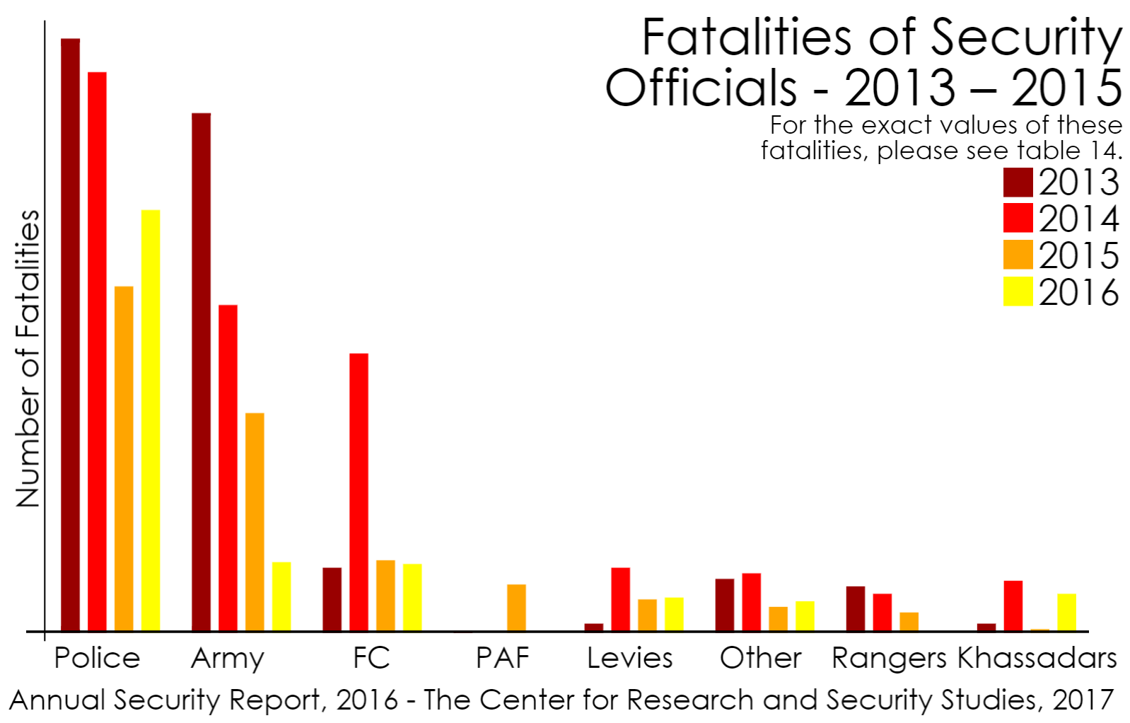There was a slight reduction in the number of fatalities of the security officials this year, though the police and khassadars suffered more losses than all other security forces (table 14). The vast majority of them were victims of target killings, suicide bombings, armed attacks, Improvised Explosive Devices (IEDs), bombs, and landmine explosions.