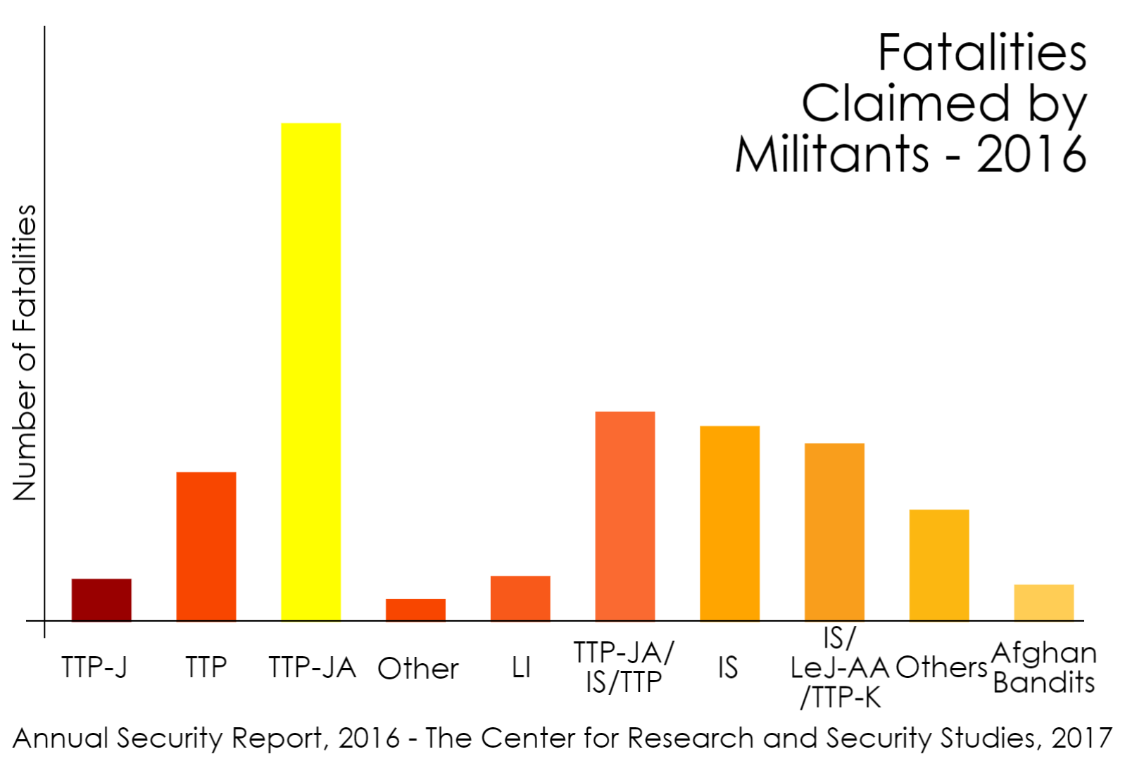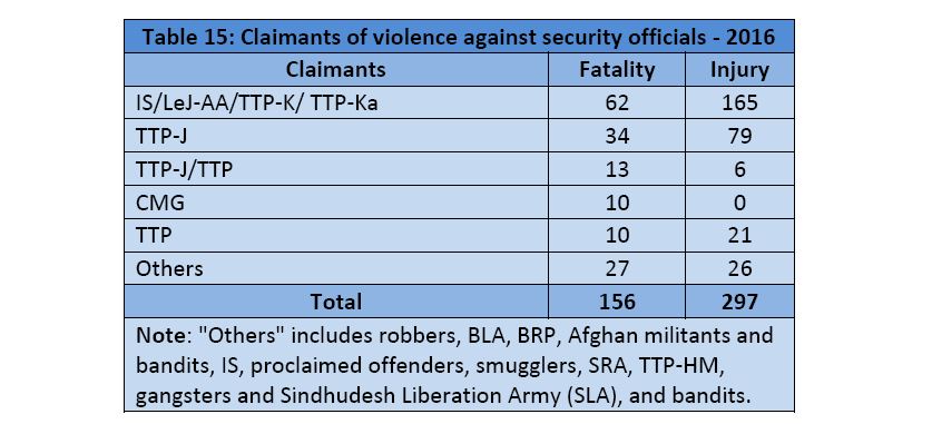 Banned militant organizations like IS, TTP, TTP-J, Lashkar-e-Jhangvi-Al-Alami (LeJ-AA), TTP-Khorasani (TTP-K), Chotu Mazari Gang (CMG) as well as insurgents claimed responsibility for attacks targeting security forces in the country in the year (table 15). The highest number of casualties occurred in Quetta when heavily-armed militants wearing suicide vests stormed a police academy on October 25, 2016 killing at least 62 persons and wounding 165, mostly young police recruits that were inside the center at the time of attack.[18] Four militant outfits LeJ-AA, IS, TTP-Karachi (TTP-Ka) and TTP-Hakeemullah Mehsud (TTP-HM) claimed responsibility for the attack which is also helpful in understanding that all of them, despite different names and locations, carry the same agenda. [19]