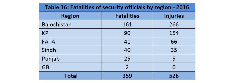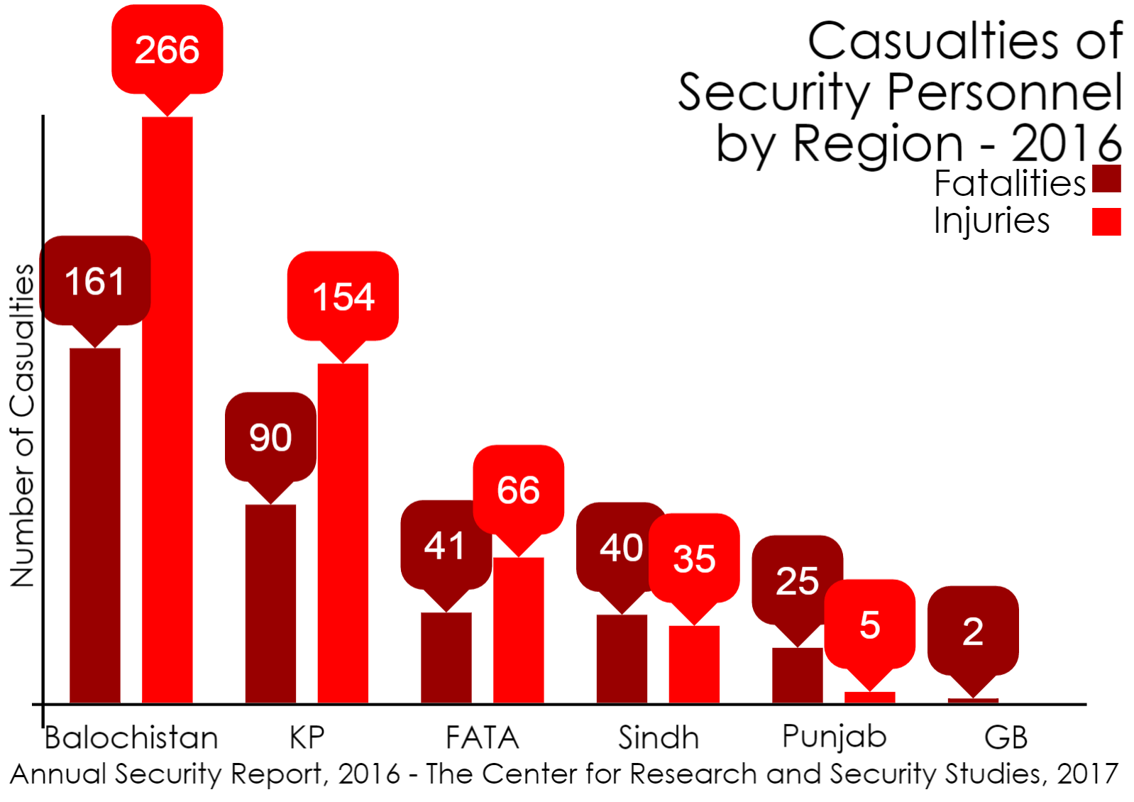 Security personnel were targeted in all provinces and the highest casualties were reported from Balochistan and KP during this year followed by FATA, Sindh, and Punjab.