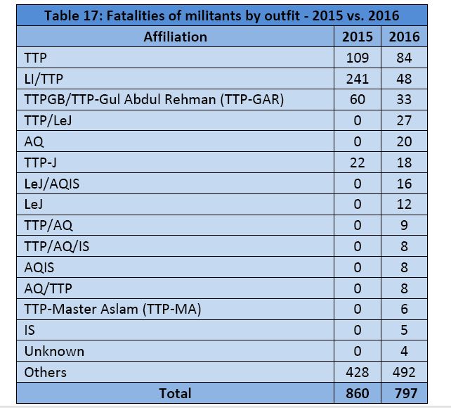Militants belonging to various banned outfits were eliminated during security operations in the country this year. The highest number of militant fatalities belonged to TTP, followed by TTP-Gul Bahadur (TTP-GB), Al-Qaida (AQ), Al-Qaida Indian Subcontinent (AQIS), and Lashkar-e-Jhangvi (LeJ). Many of the fatal militants had two or more identities like from LI/TTP and TTP/AQ/IS. This was partly due to their multiple affiliations and partly because of presence of multiple outfits at one location (table 17). Surprisingly, a number of militants who were eliminated this year suffered no fatalities in the previous year. Even the militants affiliated with IS lost their lives in counter violence operations this year though the direct presence of IS in Pakistan has always been denied by the government.[24] Sixteen Afghan militants were also killed during this year.