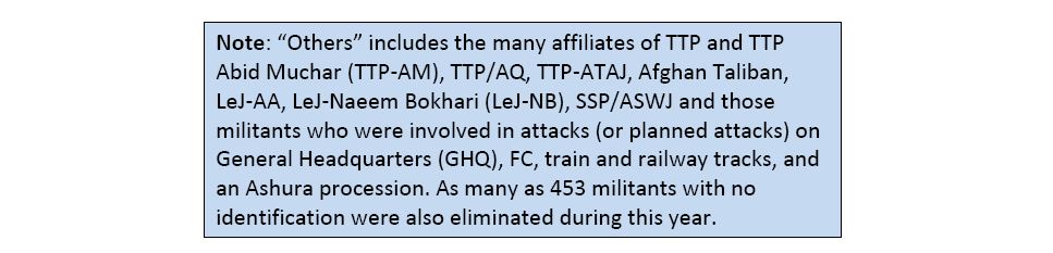 While the militant outfits claimed to have killed 91 persons in KP, the security agencies in the province managed to eliminate only 8 militants belonging to TTP-JA; four of these were killed by the armed forces at Bacha Khan University and the other 4 were killed trying to enter Christian Colony in Peshawar.[51]