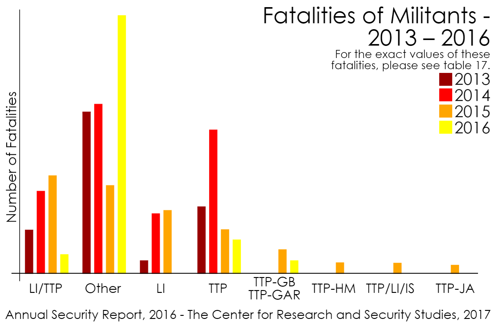 During the last two years, some incidents of militancy occurring in other countries had a link to Pakistan. In Afghanistan, as many as 139 Pakistani militants were killed by US drone attacks. Among them were some very high profile militants belonging to Tehreek-e-Taliban Pakistan (TTP) and Lashkar-e-Islam (LI). Four Pakistani militants affiliated with Islamic State (IS) were killed in Syria.