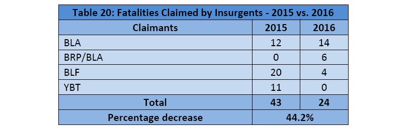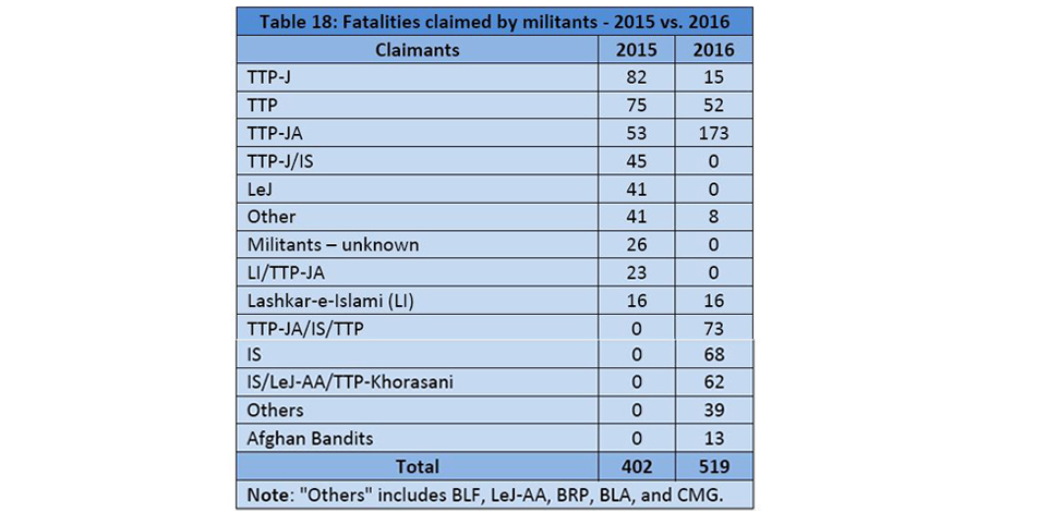 The number of fatalities (civil and security personnel combined) claimed by the militant outfits is more than the number of the militant-activists they lost this year (table 18). Although it is difficult to verify the claims of militant outfits, the security operations carried out against them soon after their attacks and the reports claiming the elimination of their activists by the security agencies confirm their presence and involvement in those acts of violence.