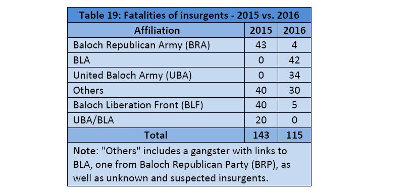 In comparison to militancy, the insurgency in Balochistan is lesser fatal and destructive based on the number of fatalities claimed by the insurgents and the number of insurgents eliminated during the last two years (table 20).