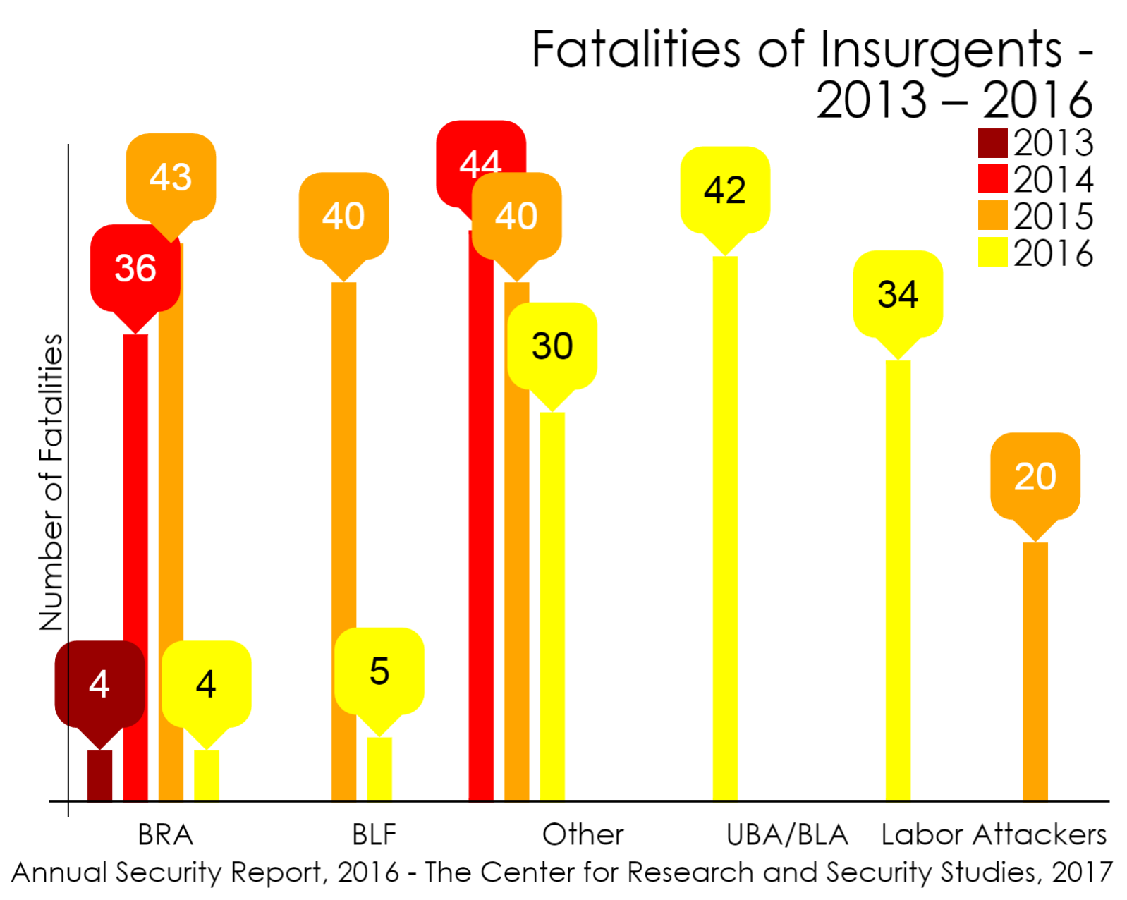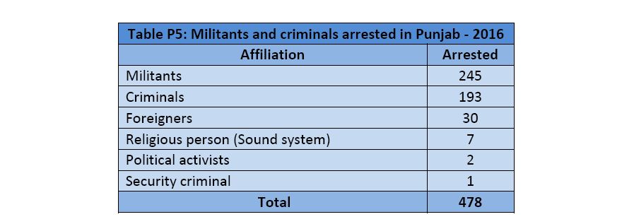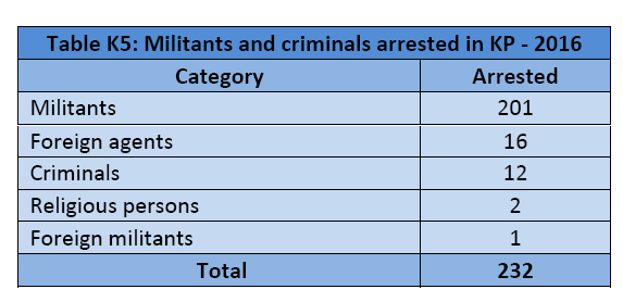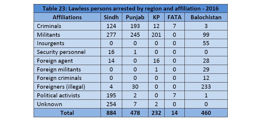Balochistan and FATA are the two important regions of the country that continue to manifest extremism and insurgency in the form of armed conflict. Throughout the country nearly 2,068 outlaws were arrested in 2016, some with known identities and groups. Only 14 of them were apprehended in FATA. This raises a serious question about the law enforcement mechanism prevailing in the region. However, 349 militants were killed in that region.