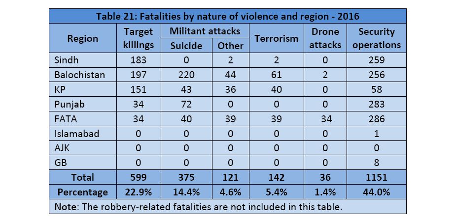 Table 21 provides a glimpse of what forms and methods of violence were the causes of fatalities during the year and which provinces were more affected. This report categorizes four basic forms of violence (i) target killings[28], (ii) militant attacks[29], (iii) terrorism[30], and (iv) drone attacks. The term “security operation” denotes all operations carried out by the armed forces and civilian law enforcement agencies against the criminals. Balochistan, KP, and FATA, were experienced nearly all forms of violence and counter operations this year while Sindh and Punjab fared comparatively better. Islamabad, GB and AJK had no report of violence, though security operations were carried out in the former two. 56% of the fatalities occurred as a result of violence carried out by the outlaws while 44% of the fatalities were the result of security operations.