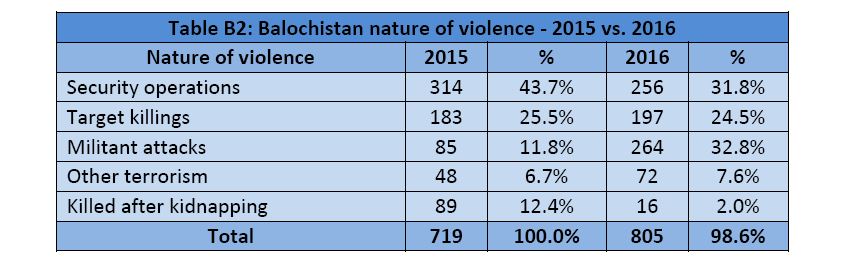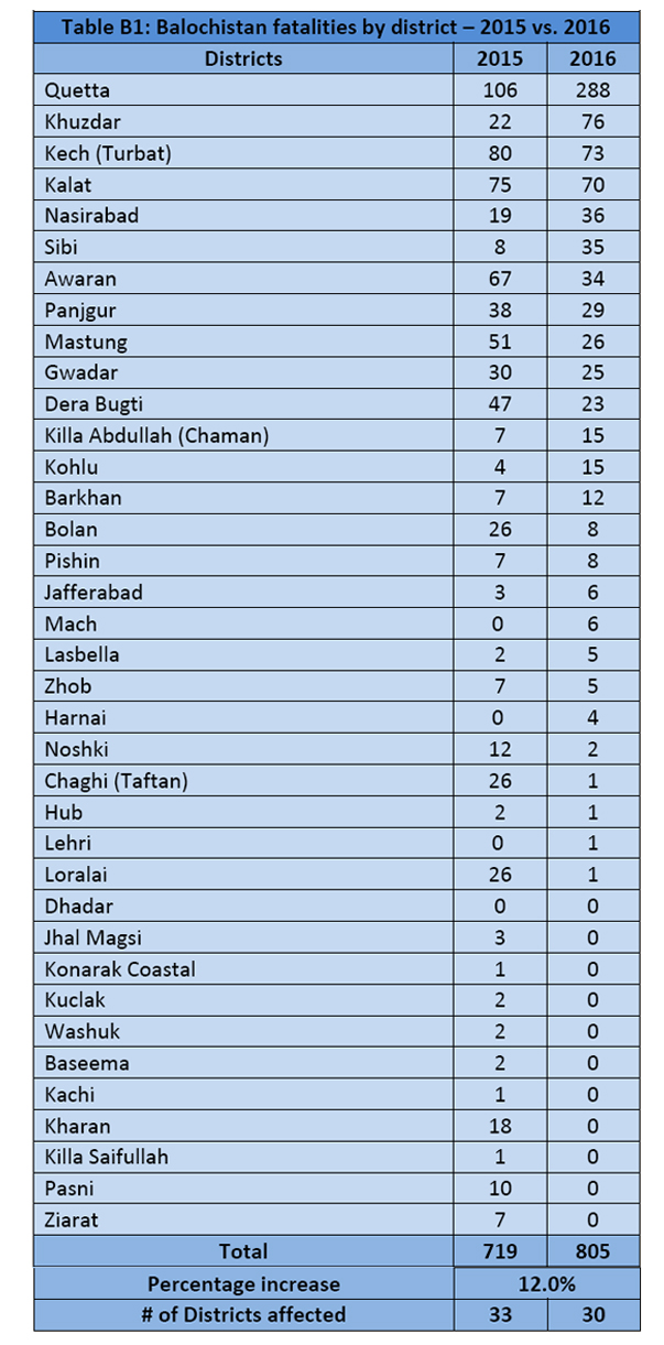 Quetta, the capital of Balochistan, lost the highest number of human lives to violence – 288 in 2016 versus 106 in 2015, an increase of over 171%. Other districts that suffered higher fatalities from violence were Khuzdar, Kech, Kalat, Nasirabad, Sibi, Awaran, and others (table B1).