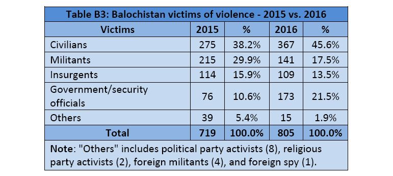More than 45% of the victims of violence were civilians while fatalities of militants and criminals were less than that. Militants and insurgents accounted for just over 31%, while government and security officials accounted for a little over 21% (table B3).