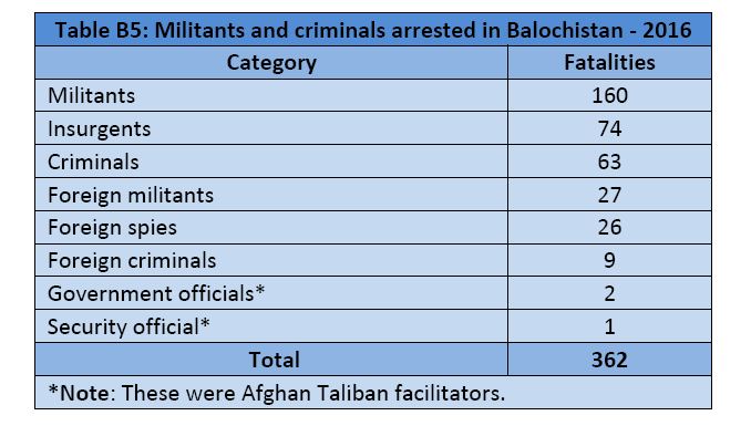 The number of high profile militants and criminals arrested in Balochistan was 363 and a sizeable number of them were foreign agents, militants, and criminals. A few government and security officials plus one political activist was also among them (table B5).