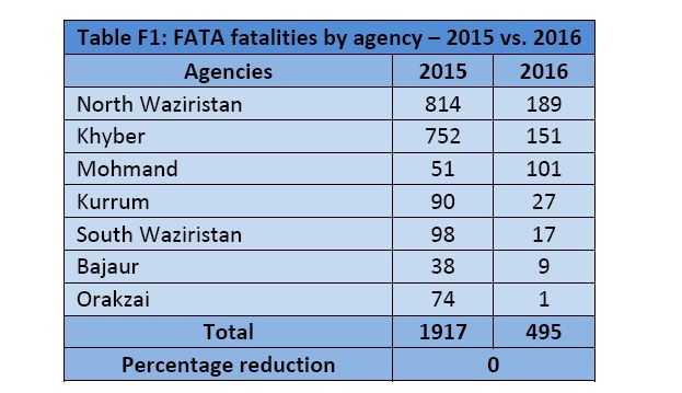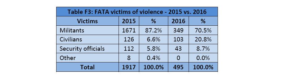 A 74.2% decline in the number of fatalities from violence was recorded in FATA this year. The number of fatalities of militants accounted for just over 70%, while the fatalities of civilians and security personnel were nearly 30% (table F3).