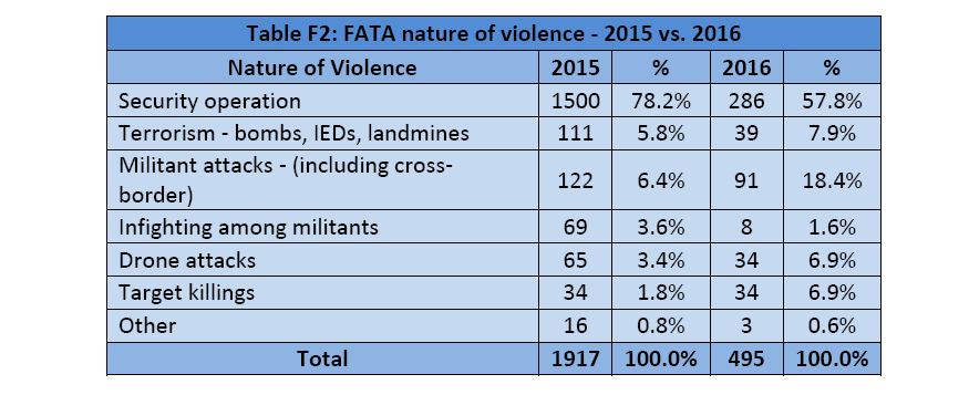 The upsurge in militancy is due to many factors including new tactics and methods used by the militants. Table F2 below shows the nature of violence that resulted in fatalities in 2015 and 2016.