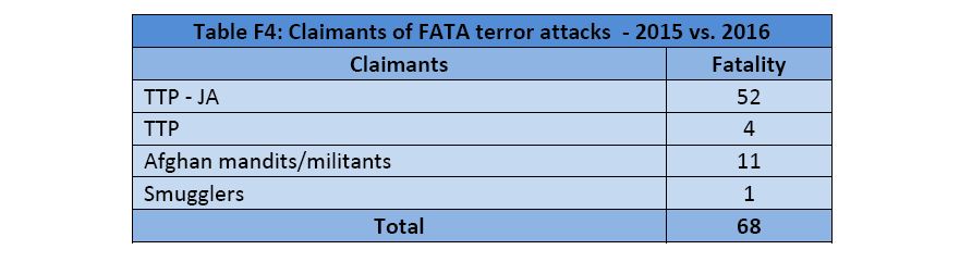 Additionally, the claimants of violence in FATA were only TTP-JA, and TTP. The Afghan militants and bandits are also shown as claimants here. However, this is based on the reports of these groups carrying out violence at the border areas, targeting the security personnel.