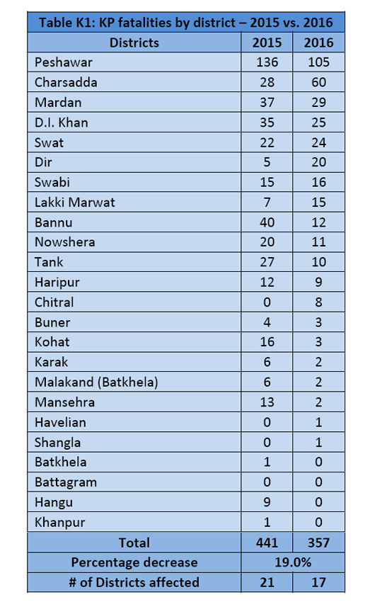 A significant decline in fatalities from violence was observed in KP this year – from 441 fatalities in 2015 to 357 in 2016, reflecting an overall 20% drop (table K1). The number of targeted districts also dropped from 21 last year to 17 this year. Peshawar, the capital of the province, lost the highest number of people to violence this year in comparison to other districts, but lesser than it did last year.