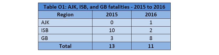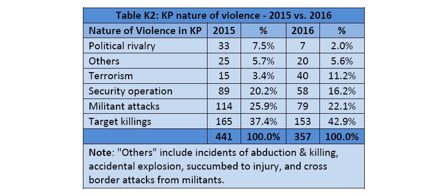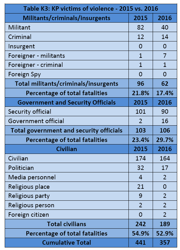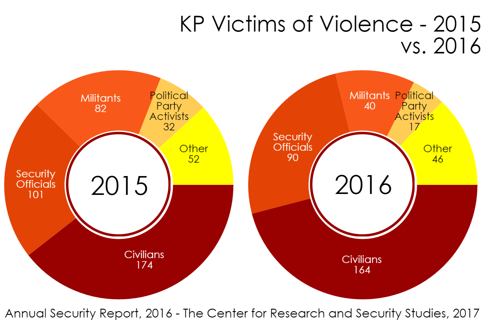 In KP, five suicide attacks took place in 2016 that left 43 persons dead, including 32 civilians and 11 others (security personnel, media persons, and political activists).