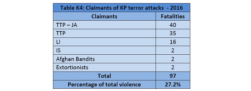 Three militant outfits, TTP-JA, TTP, and LI were the claimants of 91 fatalities that occurred in the province during this year (table K4). IS also made claims for a few terror attacks while Afghan bandits and extortionists claimed 4 suicide attacks, 6 target killings, 2 armed attacks, 2 IED explosions, 1 bomb blast, and one case of indiscriminate firing. Almost 60% victims of these attacks were civilians, 32% government and security personnel, and the remaining 8% were political activists and media persons.