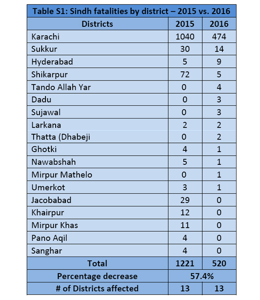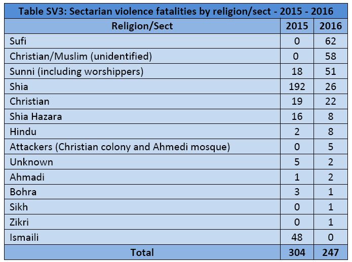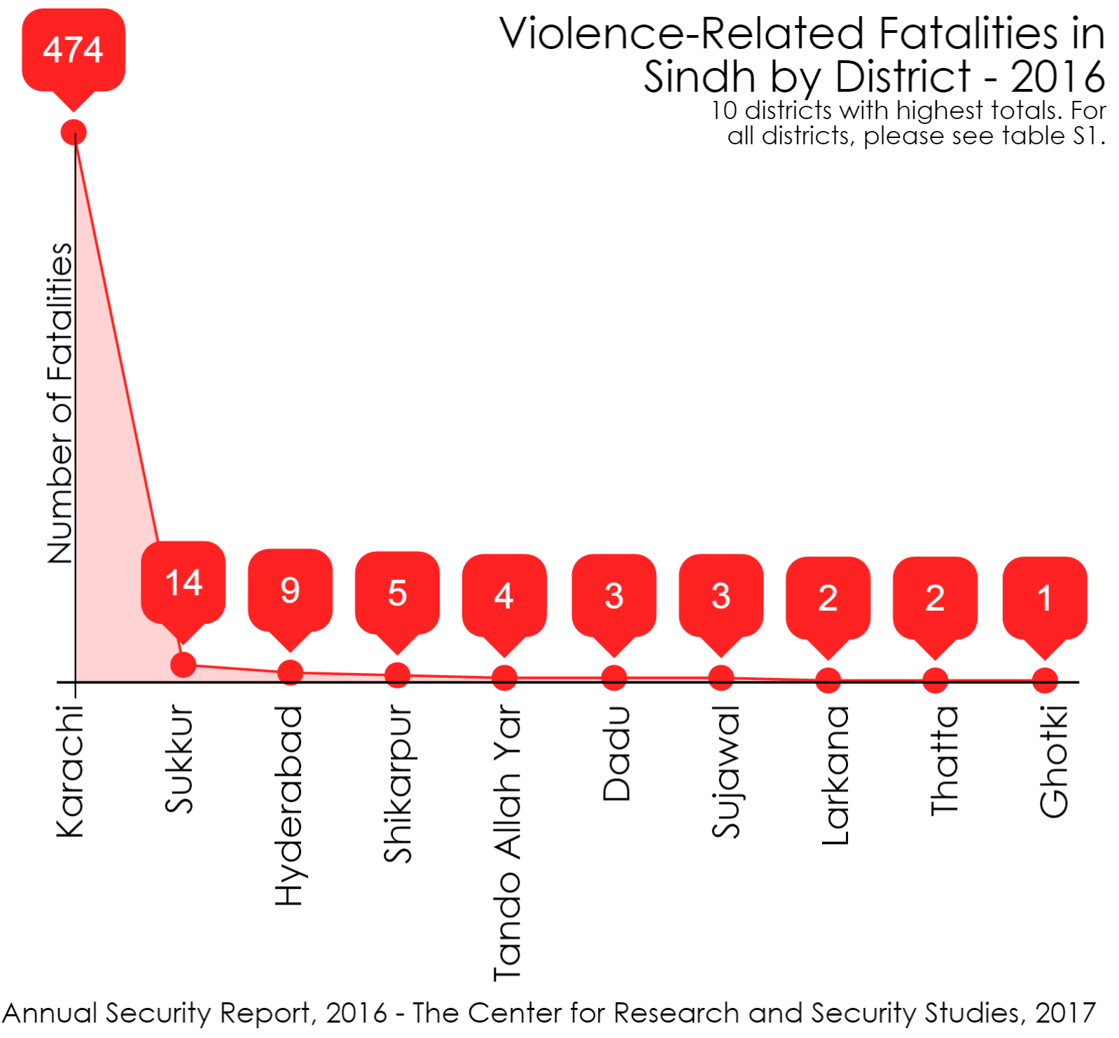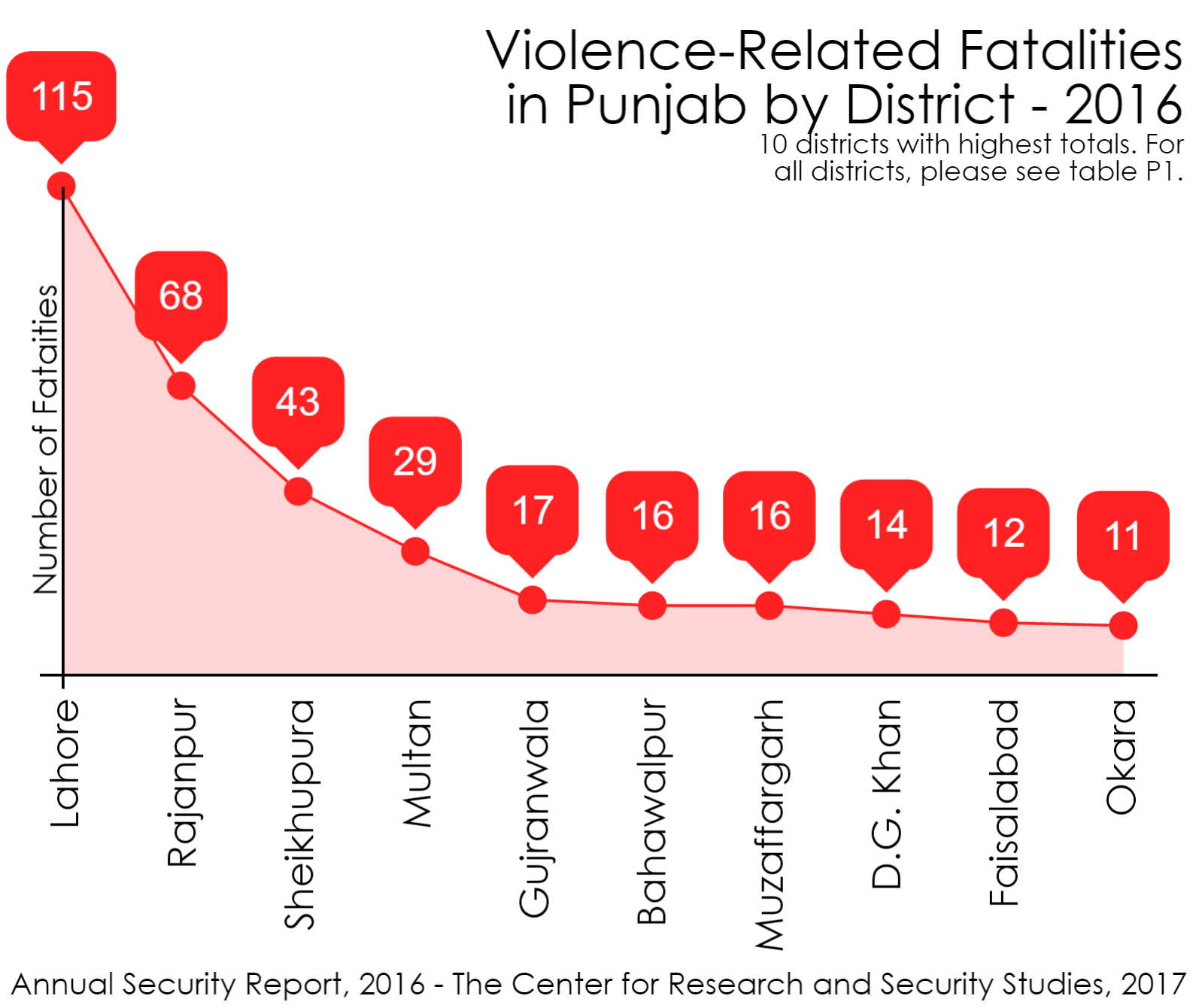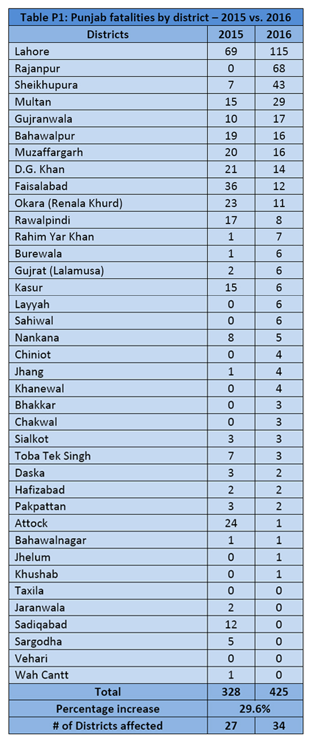 Regionally, there were some exceptions to this trend. Punjab and Balochistan had a marginal increase in violence this year. Fatalities from violence in Balochistan increased from 719 in 2015 to 798 in 2016, an upsurge of nearly 10%. Punjab lost 424 persons to violence during in 2016 which is the highest number of fatalities in the province in the last four years. Both provinces were major targets of suicide attacks thus increasing the casualty count. Balochistan suffered seven suicide attacks, leaving 220 persons dead, including 61 police trainers, 52 lawyers, and 62 pilgrims at a Sufi Shrine while Punjab had one suicide attack in Gulshan Iqbal Park, Lahore that left 74 persons dead of whom 29 were children.