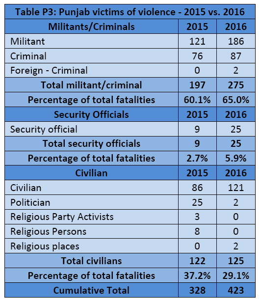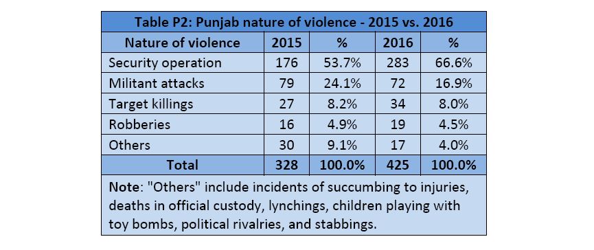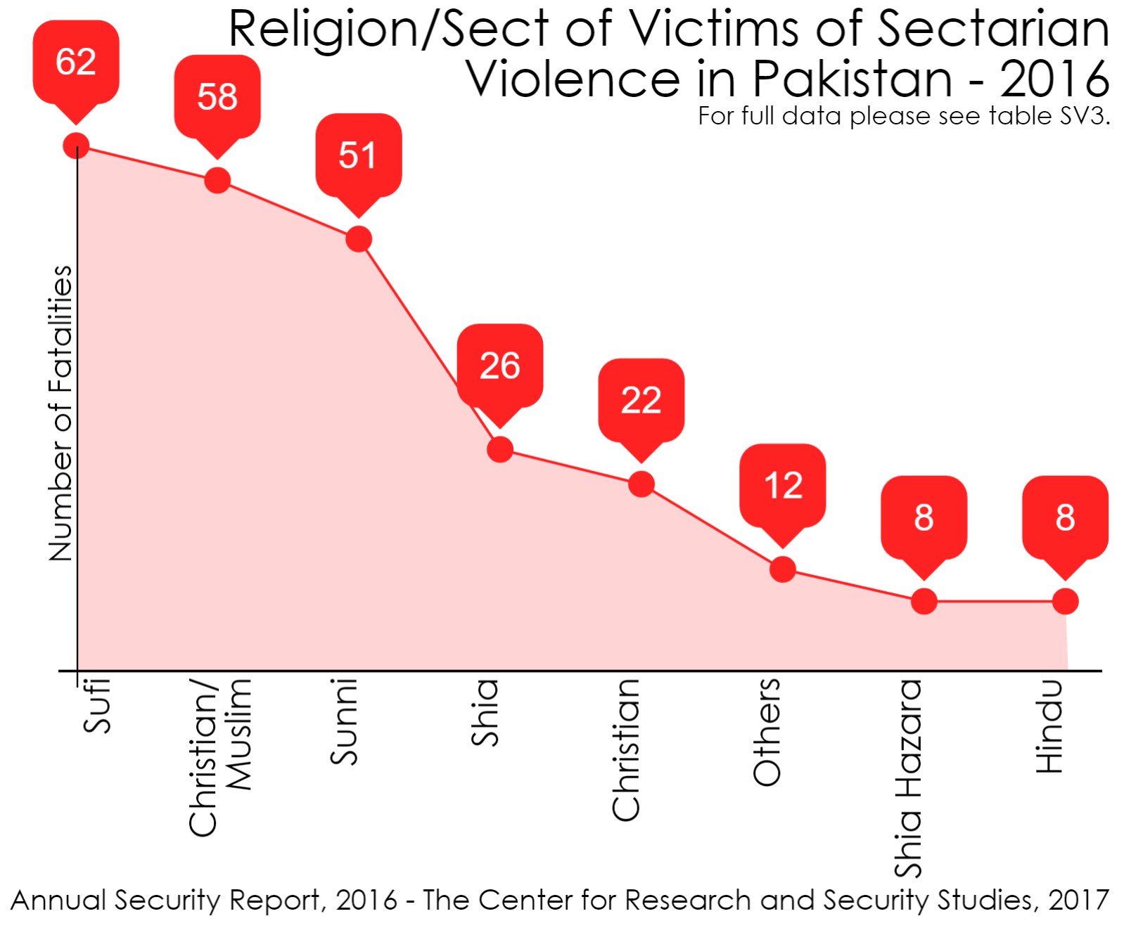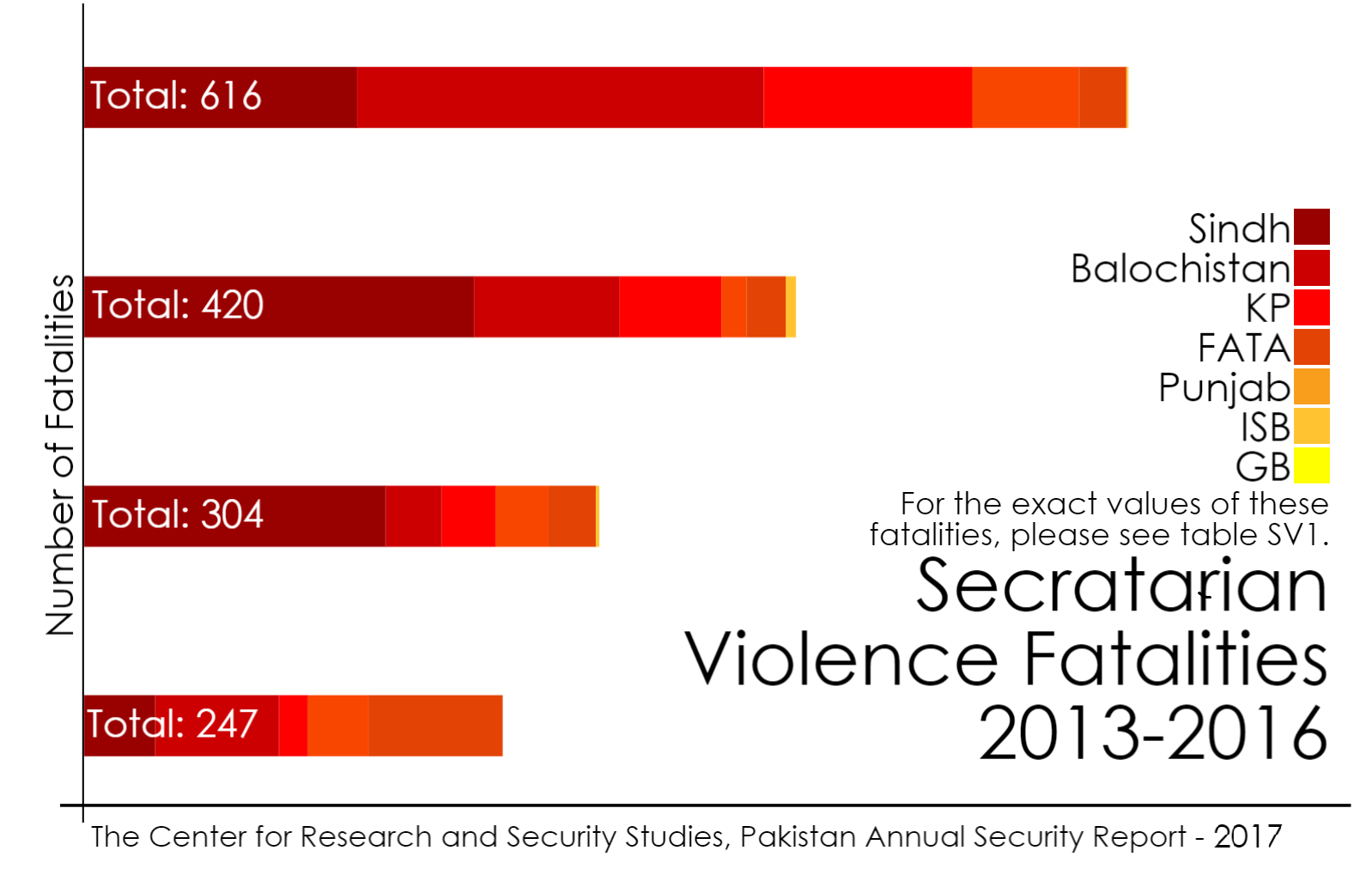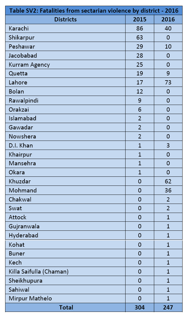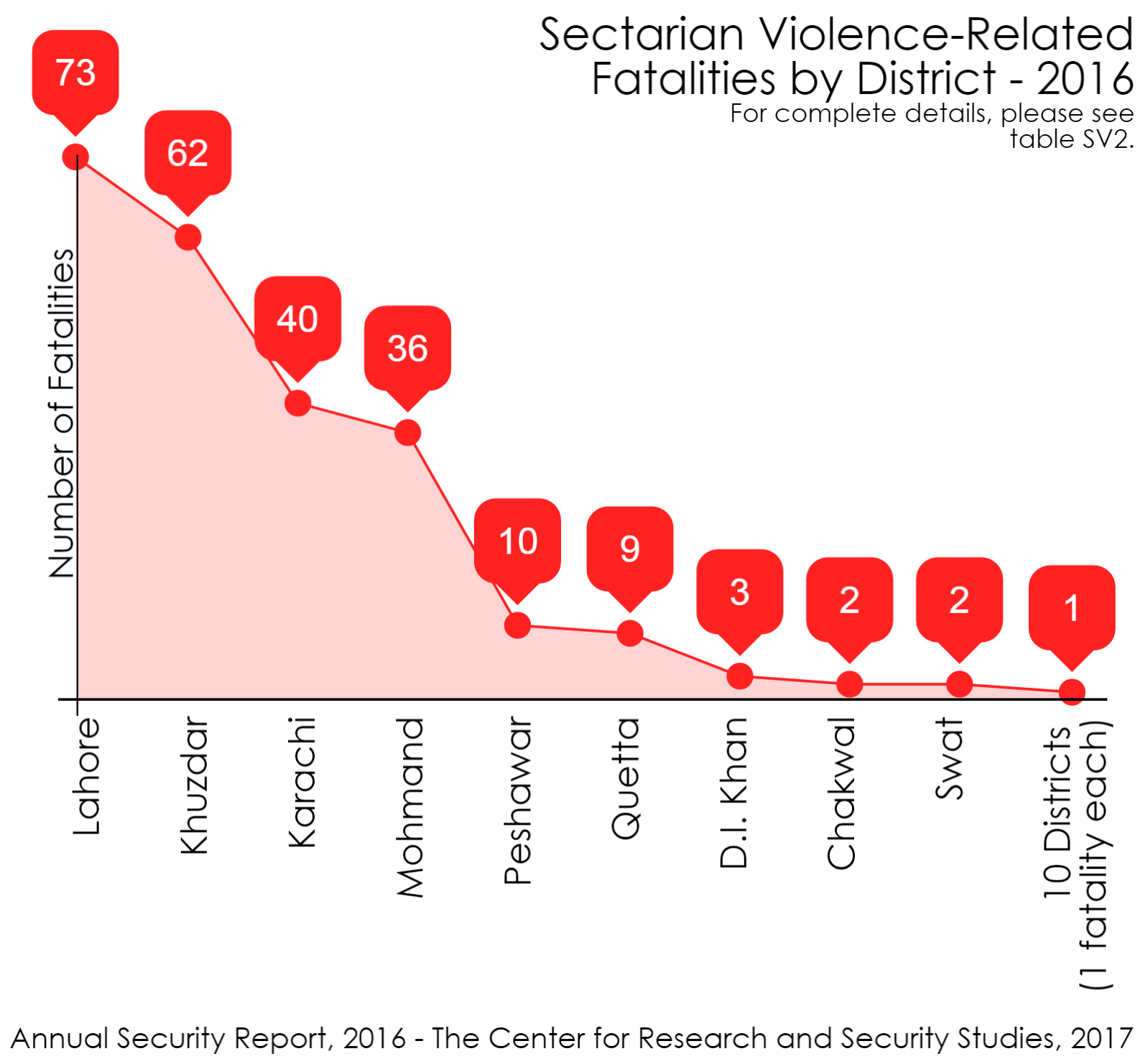 Regionally, there were some exceptions to this trend. Punjab and Balochistan had a marginal increase in violence this year. Fatalities from violence in Balochistan increased from 719 in 2015 to 798 in 2016, an upsurge of nearly 10%. Punjab lost 424 persons to violence during in 2016 which is the highest number of fatalities in the province in the last four years. Both provinces were major targets of suicide attacks thus increasing the casualty count. Balochistan suffered seven suicide attacks, leaving 220 persons dead, including 61 police trainers, 52 lawyers, and 62 pilgrims at a Sufi Shrine while Punjab had one suicide attack in Gulshan Iqbal Park, Lahore that left 74 persons dead of whom 29 were children.