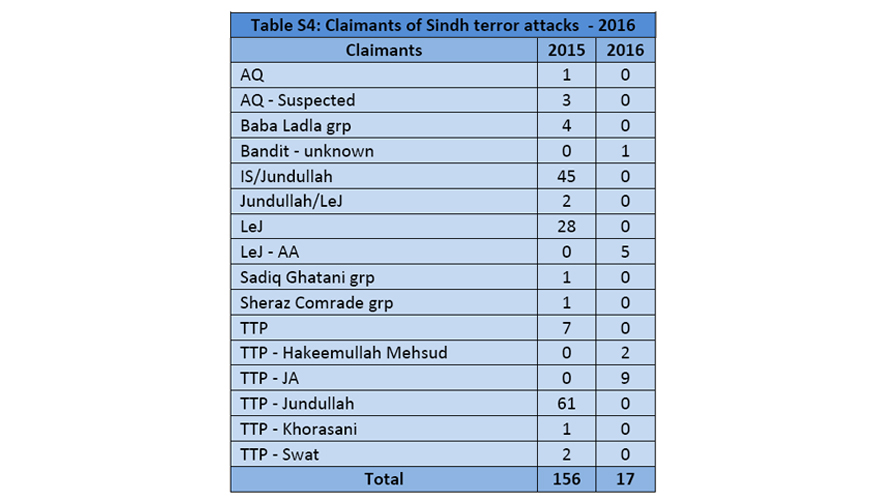 The Local Governing Body (LGB) councilors also became victims of target killings this year. The assassination of PTI minority Member Provincial Assembly (MPA), Sardar Soran Singh, on April 23, 2016 was falsely claimed by TTP[16] while a notable politician of ANP, Arshad Khan, was among the 14 victims of a suicide attack at a district court in Mardan on September 3, 2016 whose responsibility was claimed by JuA.13 The insurgent group Balochistan Liberation Army (BLA) also claimed the responsibility of a hand grenade attack at the bungalow of the Balochistan Irrigation Minister, Nawab Changez Khan Marri, in Defence Housing Authority Phase II, Karachi on January 26, 2016.[17]