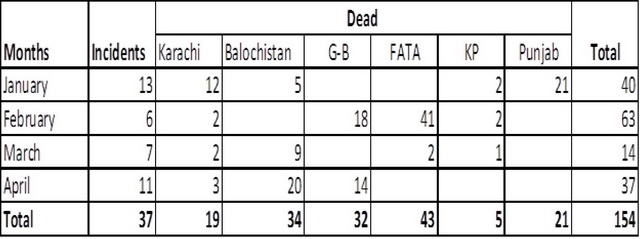 Violence continues to stain the security landscape of Pakistan, in one form or the other. The latest addition to it is a surge in the target-killings of the minority Shia Muslims, particularly in the southwestern Balochistan province, where several dozen shia Muslims have fallen to various acts of terrorism. Since early this year, sectarian terrorists, presumably sunni radicals, have been preying on Shia minority populations across the country. Statistics collected through different sources (CRSS Balochistan Monitor , Pakistan Conflict Tracker and South Asia Terrorism Portal and) suggest that sectarian violence has eaten up 154 people till April 15, 2012 (For details see chart below) across Pakistan.