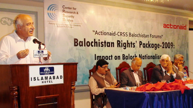 PML-N lawmaker, and former governor of Balochistan, Lt. Gen. (retd.) Abdul Quadir, Senator Dr Abdul Malik Baloch of National Party, former PPP senator Taj Haider and Dr.Assem Sajjad were among prominent speakers at the organized by the Center for Research and Security Studies (CRSS), Islamabad and Actionaid-Pakistan, as part of their campaign to raise awareness among masses about the status of implementation of Balochistan Rights– Package. The seminar also coincided with the second anniversary of the announcement of Balochistan Rights– Package, which is also called Aghaz-e-Haqooq-e-Balochistan Package.