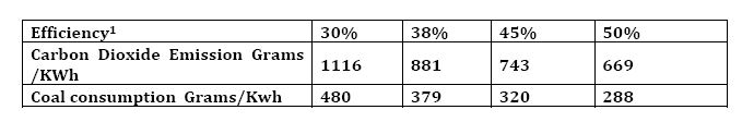 Higher efficiency translates into less consumption of coal to generate a single unit of electricity while reducing carbon dioxide emissions, mercury and local air pollutants, releasing less local air pollutants, consuming less water, and leaving a smaller environmental footprint. Above all, it means lower tariffs for consumers. The table below shows a negative correlation between efficiency and Carbon Dioxide emissions with plants at higher efficiency leading to low emissions: