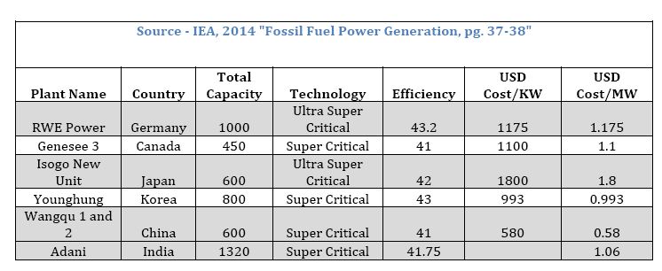 Similarly, the Adani power plant in India operates at an efficiency of 41.75%, with a cost of USD 1.06 million/MW. US$ 3.24 million/MW cost for advanced coal technologies. This is much higher than the sub-critical coal fired plants that are operating in India having an average efficiency of 3 1.80%.