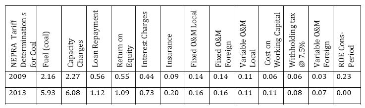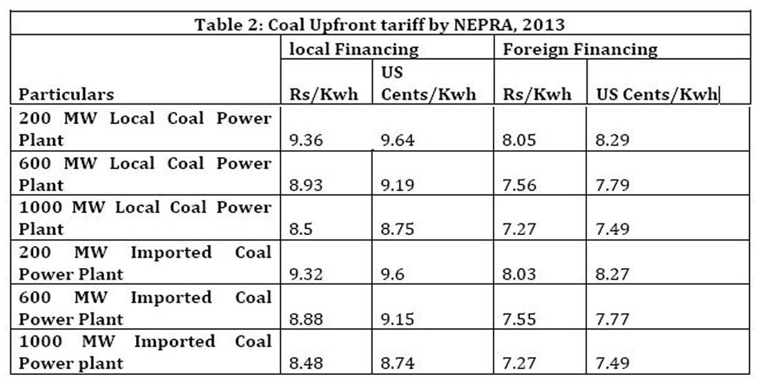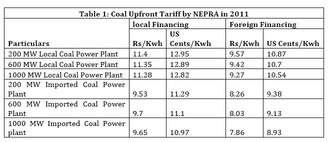 The National Electric Power Regulatory Authority (NEPRA), in a bid to promote coal-based power generation in the country, approved an attractive up-front tariff for coal-based power plants in 201112(See Table below).