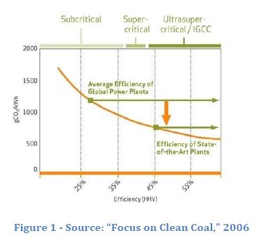 Towards this goal, Clean Coal technology is being developed to mitigate the environmental impact of energy generation through coal. As seen in the graph below, the type of plant determines the efficiency of the plant, with a range from subcritical to ultra super-critical/IGCC technologies.
