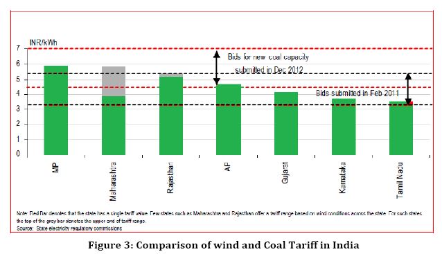 A recent study identifies that Feed in Tariffs of wind in key seven states39 in India range from INR 3.51-5.92/Kwh (US cents 6-11/Kwh). The tariff in some key wind states in India (see figure 3( is as low as INR 4.5/Kwh(US cents 8/kwh), which is the lower end of bid received for new coal capacity in 2012, making wind cost competitive with new coal based generation capacity (See chart below).