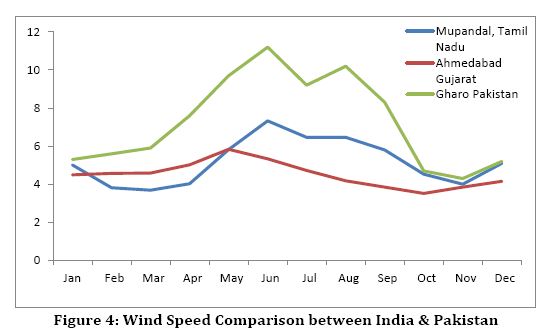 The wind speed in India poses large variability, leading to fluctuations in power generation (see Figure below). However, in the case of Pakistan, wind variability is far less that present in India and wind speed is 30% greater than average speed available in India.