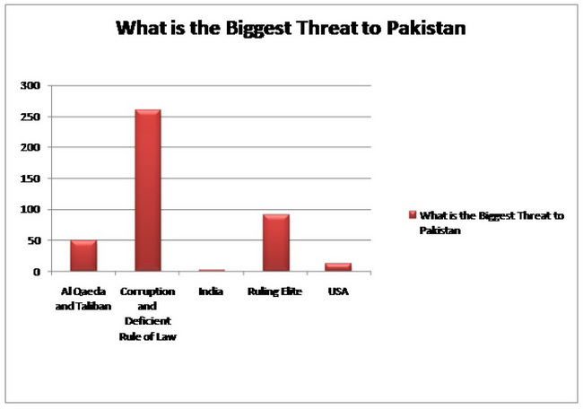 As many as 85 percent of the Pakistanis polled by the Centre for Research and Security Studies believe that the biggest threat to Pakistan comes from ‘corruption and deficient rule of law,’and the ruling elite. Some 63 percent pointed to corruption and deficient rule of law while nearly 22 percent considered ‘the ruling elite (politicians, landed aristocracy, army and bureaucrats)’ as the biggest threat to the country, followed by roughly 12 percent for whom Al Qaeda andTaliban constitute the biggest threat to Pakistan.