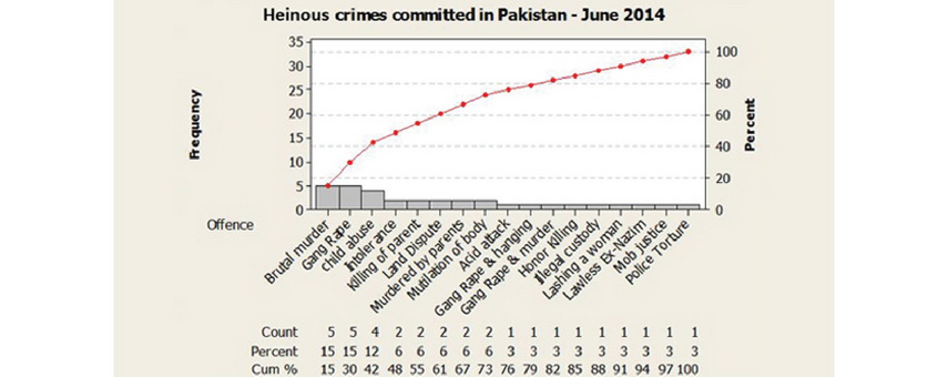 Incidents of heinous crimes in Pakistan continued unabated in the months of May and June 2014. An analysis of incidents involving extortion, abduction for ransom, acid attacks, murders, gang-rape with murder and cold-blooded executions in the name of family honour, mob violence ( involving police, demonstrators, lawyers (also called heinous crimes) reflects the extent of growing violent tendencies across Pakistan.[1]