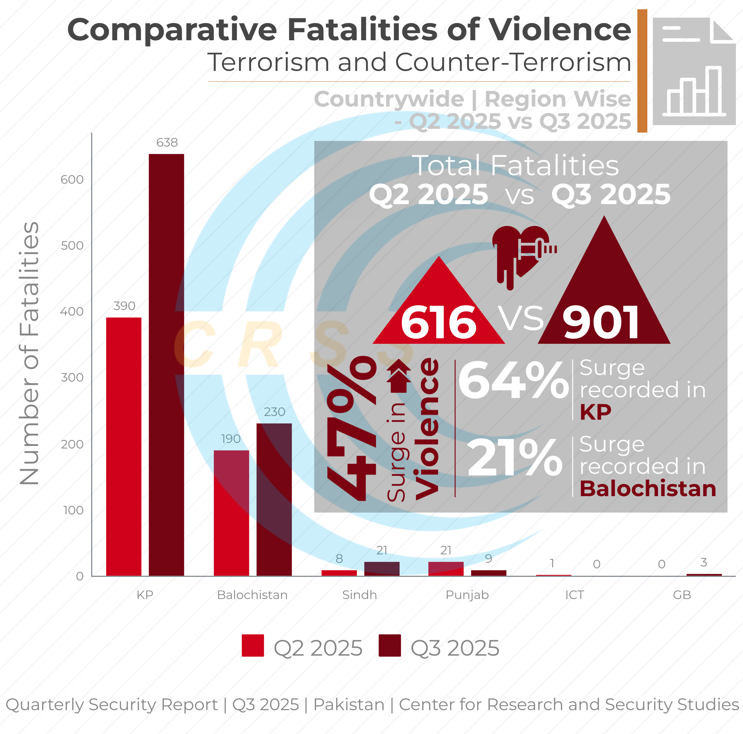 With at least 901 fatalities and 599 injuries – among civilians, security personnel, and outlaws – resulting from 329 incidents of violence, including terror attacks and counter-terror operations, Pakistan witnessed an over 46% surge in overall violence in its security landscape for the third quarter of 2025, according to the Center for Research and Security Studies (CRSS).