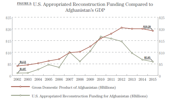 The US claims of reconstruction in Afghanistan also look like more of a window-dressing as financial aid coming from US equalled, and sometimes exceeded, the overall GDP of Afghanistan. The US government has so far injected more than $110 billion into the Afghan economy, yet the socio-economic situation has worsened over the years. Progress of reconstruction projects, such as schools and hospitals, have also remained highly prone to corruption resulting in sluggish progress.